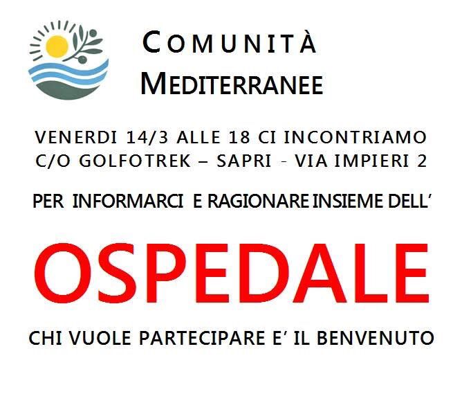Comunità mediterranee oggi alle 18 propone un incontro C/o Golfotrek a Sapri in via Impieri, 2 per informarsi e ragionare sul futuro dell’ospedale di Sapri.